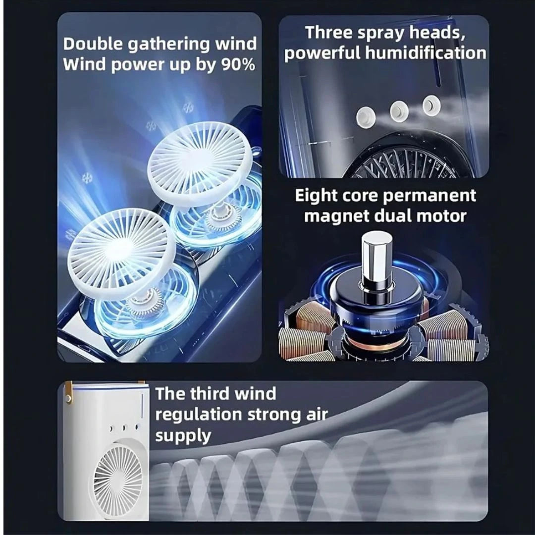 Equipped with dual motors, triple mist spray, and 90% boosted wind power — this fan delivers strong air circulation and effective humidification with three-speed control.